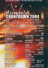 Vision Quest's lineup for this countdown resembles a killer day at Gathering: Infected Mushroom, X-Dream, Dino Psaras, Bamboo Forest, Juvenile, Karmachanics and Intergalactic will play live. The only Gathering regulars who will be missing are Skazi, who just played here last weekend, Astrix (played Differ last month) and G.M.S., who will be working across the bay.