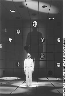 In the second act the captain, dressed all in white, stands alone and accused in the center of the "box." Filling the holes, though, are caricatured masks representing public opinion, with different faces picked out by lights as they "speak." So, while the captain conducts his defense and self-analysis in a calm and logical way, the masks challenge and attack his concept of morality. Asari wonderfully emphasizes the polarity of these two opposing positions by juxtaposing Kusaka's rich elocution and the masks' electronic speech.