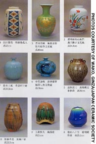 Those whose curiosity was piqued by last month's column will have the chance to see a breast-shape piece from the "Maria" series of Hagi's newly crowned Kyusetsu Miwa XII. More spectacular, though, are neriage marbleware platters from Ito Sekisui V. His molded red flower petals burst off the forms with uncanny reality and clearly show why this Sado Island potter was given the lofty designation of living national treasure.