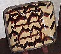 Slipware plates are large and were used for cooking as well as serving. Designed to be put into an oven, they are unglazed on the base. The designs inside the dishes are free-flowing and quite jazzy. Most have a dark brown or creamy yellow background, onto which the designs were drawn. The artisan worked quickly, slip-trailing liquid clay over the glazed body. We find pieces decorated with zigzags, squiggly lines, checkered patterns, birds, and even dates -- 1769 or 1790 for example. (Most slipware plates date from the 18th and 19th centuries.)