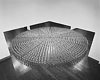 In one piece, "Hinomaru," the artist has created the central red sun by impressing numerous hanko (personal seals) on washi (Japanese paper). In the other, "Banzai Corner," the artist has erected tiny, red plastic Ultraman and Ultra Seven robot toys shoulder to shoulder concentrically to form a fan shape in front of two mirrors erected at a 90-degree angle to each other. The robot toys and their images in the mirrors form a red circle, again echoing the Hinomaru.