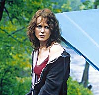 That may seem a nebulous idea on which to hang a film, but rest assured, "The Human Stain" delivers in many ways, particularly in the performances; it's certainly fun to watch Kidman -- with her regal, ethereal looks -- mutate into a low-rent temptress, cigarette jammed in puckered lips, sporting a snake tattoo and a scowl. Harris is just as good as her wacko ex, exuding a scary calm that only betrays the fury beneath in his cold, cold eyes. He starts a session with his therapist by saying "Let's get one thing straight, I'd never hurt her," and ends it with "I should have killed her years ago." It's only Sinise, with his strained, Al Gore-like demeanor, who lets the energy drop.