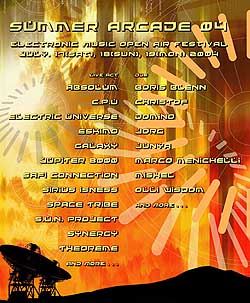 Highlighting the lineup for this mouthwatering monster mid-summer event are live acts Absolum, Electric Universe, SAFI Connection, Space Tribe, S.U.N. Project, plus DJ sets by Domino, Jorg, Christof, Boris Glenn and Olli Wisdom, "and more," promises the preliminary flyer.