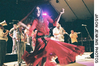 Then a spotlight cut through the sky to a place near the exit. There were the Romanians, horns glinting in the glare, with the Kodo drummers marching through the crowd toward the stage. Miss Romania appeared in flowing orange, flanked by fan-bearing Japanese dancers. The chest-rattling taiko beats provided a perfect framework for the Romanian's brassy tendrils to wrap around. Hearing them together made complete sense, as if it had always been this way. The festivities continued until 11.