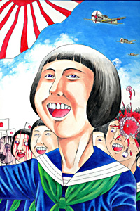 Manga artist Shintaro Kago, who will contribute several illustrations from his manga book covers, certainly knows how to test the limits of what is art (and good taste) with his oftentimes sexually and politically charged manga comics. In one strikingly colorful image, uniformed Japanese schoolgirls wave the Hinomaru flag as Zero fighter planes circle the bright blue sky. One girl has an eyeball falling out of its socket from a gunshot blast to her head. Another hairless girl stands beside a wild-eyed and bloodied schoolmate in a state of purplish radioactive decomposition.