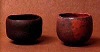 I'm actually aiming for Koetsu and Chojiro as models. In fact, I've been making many raku chawan and I don't call them raku, but kuro (black) or aka (red) chawan in order to make the distinction from raku. I don't care for the second generation's chawans [made by the second raku potter -- the raku family is now in its 15th generation]; they tend to have this extra gloss about them. I love Chojiro's worn-out, matte-textured chawan. I'm actually trying to surpass Chojiro!