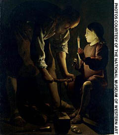 An exquisite stillness pervades this picture, as with the copy of "Christ in the Carpenter's Shop" (1645), where the attention to mood is shown in the minute observation of the effects of light in certain areas, particularly in the translucency of the Christ child's hand silhouetted against the candle, which reveals even the dirt under the fingernails!