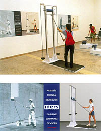 The tools of capitalism are a popular subject, and the appeal of consumer goods is the focus of the "futuristic propositions" of Antal Lakner. He sees his art as a catalyst for rethinking environments, labor and life, and his ironic "Passive Working Devices" (1998-2000) are gym machines that transform menial manual activity, like pushing a wheelbarrow or painting a wall with an extending roller, into a form of leisure and entertainment.