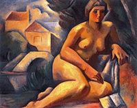 It was on his second journey that he became a pupil of the minor Cubist artist and popularizer Andre Lhote. His Cubist-inspired works are his most challenging -- and Lhote's addition of colorful realism to the Cubism of Picasso and Braque can be seen in figurative paintings such as "Madeleine le Punchi." The painting turns the sinuous contours of the nude figure into blocklike planes that mimic the faceted architectural forms in the background. Even in works like this, Kuroda is a long way from Picasso and Braque -- he retains clear delineation of pictorial objects and sets them in smooth transition between foreground and background while attending to the local colors, like the pinks and oranges of flesh, green foliage and blue sky. (Asian Cubism can be explored in greater depth at another exhibition currently in Tokyo, "Cubism in Asia: Unbounded Dialogues" at The National Museum of Modern Art, Tokyo, running till Oct. 2, which explores what happens to forms of artistic expression when they cross the cultural boundaries between Europe and Asia.)