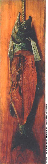 The effects of this school can be seen at "The Pioneers of Modern Japanese Oil Painting" at the Museum of Modern Art, Shiga (Oct. 1-Nov 13), particularly in the numerous landscapes on show. Yuichi Takahashi's "Salmon" (1877) -- an oil-on-canvas of a semi-gutted fish -- while evincing less a Barbizon style and more the manner of a 17th-century Dutch still life, is held to be a central achievement in Japanese realism. It also serves to show just how quickly (10 years after the Meiji Restoration) Japanese artists acquired the technical facility forged over centuries in the Western world. For this work and others, Takahashi -- who studied under the less accomplished painter Togai Kawakami and Charles Wirgman, a correspondent of The Illustrated London News -- is regarded as the pioneer of Western oil painting in Japan.