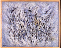 "Lyric of Blue," for example, recalls the painting of American Abstract-Expressionist Jackson Pollock -- but only momentarily. The delicate skeins of black paint, which are almost calligraphic, compose a serene interplay with the mottled blues and whites that dapple the background. Judgments of artistic quality based upon superficial visual similarity in the post-WWII period are no longer much of a justification for asserting the charge of derivation under a causal scheme -- as if Pollock did something to Nambata to make him paint that way.