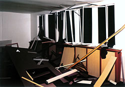 Actually, Thomas Demand's "Room" (1994) is a surprising re-creation of the conference area where Count Claus von Stauffenberg attempted to assassinate Hitler in 1944. Demand photographs crime-scene models he makes from cards and paper, but he leaves viewers without the benefit of the essential historical details. The picture is an abstracted construction -- erasing "evidence" -- that makes observers wonder if real historical settings might be so entirely sanitized of historical associations.