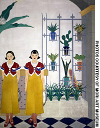 Several paintings are strong simply because they defy easy categorization. Shunko Saeki's "Tea Room" (1930) has a Taisho Era feel, combining a Japanese-style flatness with Art Deco details. Its life-size subjects alone, two waitresses against a wall, make it hard to ignore. In "Battle of the Bears and the Wolves" (1938), Hans Grundig uses strong reds and greens to portray the violent and unstoppable animals in a dynamic but murky allegory. Grundig was a commercial painter, and a Communist, and though "Battle" tends toward Expressionism, it feels like something else entirely.