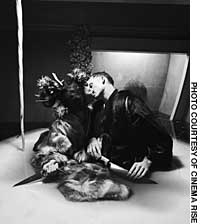 While unclear symbolism abounds in the movie, it isn't until Bjork and Barney reach the Nisshin Maru that it becomes overly belabored and self-involved. As the two are led to different rooms on the ship in anticipation of some approaching ritual, they experience arbitrary preparations -- Barney's head is shaved and fitted with broken horns, Bjork takes a hot bath with lemons and has her eyebrows shaved off. They then are both attired in giant fur coats with massive shells on their backs.