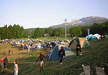 Gettng to Myoko Suginohara is a breeze because the ski resort is just 6 km from the Myouko Kogen IC on the Jyoshinetsu Expressway (from the Kan-Etsu Expressway -- the smoothest highway leaving Tokyo.) For "Spun Field 2006," our group departed from Shibuya Station around 10:30 a.m. and we reached the venue less than four hours later, even with a 30-minute service-area break and driving through some ridiculous midday fog. A lower stage parking area will serve as the ticket checkpoint and where you get your wristband. The main parking lot itself is huge, paved and close. The tent sites are on softer, but not flatter ground than last year and afford either a beautiful view or plenty of shade.