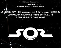 Mother Records presents "Space of Sound (S.O.S.)" at Hakuba Tsugaike Kougen in Nagano Prefecture. Tickets are 14,000 yen at the gate. Live acts include Atomic Pulse, Beckers, Logic Bomb, Midimiliz, Pop Stream, Protoculture, Xerox and Illumination, X-Noize, X-Dream and more, plus DJs Ta-Ka, Daijiro, Messie, Ryo, Nate Raubenheimer, Arturo and more. Music starts at 5 p.m. on the first day. (Last year, the gates were open by noon.)