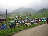 Hakuba Tsugaike is a spacious resort with wide ski runs (read: not much shade) and lots of setup options. The S.O.S. Chill Village in 2005 had the flattest and most shaded tent sites, although the vendor-lined path to it was paved in mud-covering cardboard by the second day. A gondola ride (in a decent size, enclosed car) is required to get up to the venue from the parking area. Access to this lift was not too difficult last year and the gondola staff are used to moving tourists.