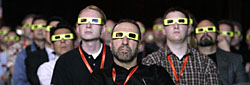 "They are battery-powered and synchronized to on-screen images via infrared signals," Kaye said. "They contain liquid-crystal display screens in the lenses which alternate at a rate of 96 frames a second, twice as fast as the projected image. The LCD screens allow the right and left eye to view separate, discrete images at a rapid rate to create for the viewer the illusion of three dimensions."