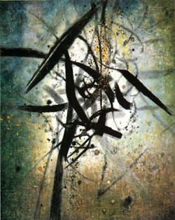 Soon after, Insho was making full-blown abstractions, as in "Symphony" (1961) with its dancing calligraphic swigs of black paint that course above an intense whitish void. "Reaction Against Standard" (1960), contrasts large swathes of black paint, heavily worked and tangled brushwork, and clear, resolved line work. Some works at first seem to have the slap-dash application of paint that characterized midcentury American Abstract Expressionism, but the majority were carefully prepared first in under-drawings, then transferred and transformed into finished works. The process highlights Insho's training in nihonga.
