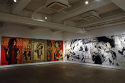 Now she has helped bring the works of U.S.-based artists Sheppard Fairey and WK Interact to Shibuya's Tokyo Wonder Site (www.tokyo wondersite.com) for a show and other side events. Fairey, showing under his Obey Giant moniker, has a well known back story among followers of street culture. In the early 1990s, a lazy afternoon at the prestigious Rhode Island School of Design, when Fairey taught a friend how to silk screen a newspaper clipping of pro wrestler Andre the Giant, turned into an international social experiment in meaningless messages. As Fairey's stickers bearing the ominous "Andre the Giant has a Posse" tag started appearing in cities across America and the world, interpretations and attributions abounded. Now that experiment has turned into business as Fairey trades in high quality art prints of stylized icons and figures of propaganda whose meaning has been reappropriated with antiauthoritarian slogans. Though in photos they verge on illustration/graphic design, in person the superb craftsmanship put into the surfaces of his work adds another dimension.