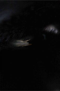 As the title suggests, the show is literally black, black, and more black. On display are five huge photographic prints, heavily inked scrapbooks and two "secret" objects. Despite the thought given to this installation, the 130-cm x 200-cm prints are the show's strongest feature as they are big enough to get lost in. Concerned with "presence of light in almost absolute blackness," at a distance they appear to be solid black, but on closer inspection they bear faint light sources.