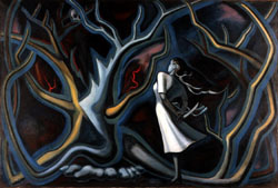 We see the Surrealism he had imbibed there, invigorated in "Yoru (Night)" (1947). A stylized woman concealing a knife behind her back peers into a tangle of antler-like branches which, with a line of white rocks/teeth at the bottom of the canvas, form a massive face. It is unclear exactly who is being threatened in this scene, and by what. This ambiguity, and Okamoto's skill in presenting it, gives the image its dreamlike strength.