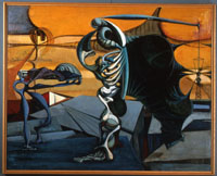 It is useful to view the work of an artist such as Okamoto in the context of work by that artist's contemporaries. As much as one may enjoy, for example, Tatsuo Ikeda's George Grosz-like renderings of bloated fish, bloated men and bloated fish-men, or Hiroshi Teshigahara's Chirico-influenced "Siren-to (Siren Island)" (1951), the first impression of nearly all of the work by Okamoto's contemporaries is that it is similar to that of one or another European master. Okamoto's work, on the other hand, leaping off the wall as it does from among the more derivative art with which it is surrounded, is always, unmistakably, Okamoto's.