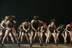 Forty sweating bodies lined across the stage move in unison, hands slapping legs with open palms. A surprisingly loud crack echoes through the quiet of the theater. Then another and another as the performers quickly build up a complex rhythm, varying the pitch of the sound hitting other parts of their bodies such as their biceps, forearms and chests.