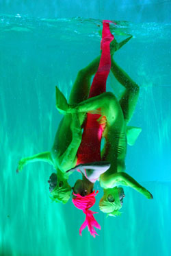 Takeda's big number, titled "Sea Angel," which is performed with two other swimmers in a massive acrylic tank perched on one corner of the stage, is one of the revue's most popular routines.