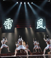 Big banners bearing the words "thunder" and "wind" in kanji hang behind them. Taiko was used to raise the morale of soldiers going to war during the Sengoku Era (1477-1573), and the performance, including the occasional spirited shout by one of the participants, is reminiscent of the image of soldiers going into battle.
