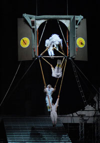 Based on Chinese bungee jumping, a popular acrobatic routine in China, performers leap off a 4.9-meter-high bar to which they are connected by bungee cords — only they spin around the bar instead of bobbing up and down.