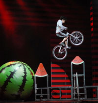 Mountain biker Daisuke Morikami launches his bike off a 4-meter-high platform onto a mattress, then goes airborne off the stage and races through the audience, before bunny-hopping up the stairs and onto the stage again.