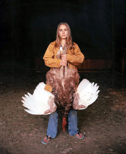 The choices of two of Laura McPhees's photographs, "Quartered Rocky Mountain Elk, Milk Creek, White Cloud Mountains, Idaho" and "Mattie with Bourbon Red Turkey, Laverty Ranch, Custer County, Idaho" (2004), show the artist at her edgiest and most powerful. Both images speak of life, death and land; "Mattie," in which a young woman dangles a freshly killed turkey upside down, feels like a mysterious symbol of the first promise of American bounty.
