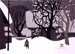 While the texture of Saito's prints comes from the grain of the wood and random factors in the printing, his creative focus is on the composition of clearly defined visual elements. Such a focus, rather than nostalgia for his home region, motivated him to create his famous "Winter in Aizu" series of prints in 1938. He often returned to the theme of snowy rural Japan in later works due to composition — the usefulness of snow is demonstrated in "Snow in Aizu" (1970), where it helps define objects and creates a sense of space and isolation that translates well to wood, and ultimately to paper.
