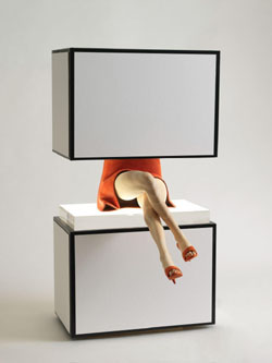 Interpretations of the Chanel theme range from the elegant to the outlandish, the subtle to the self-evident. Architect and painter Kasumasa Noguchi playfully weaves Chanel's eminent trademark in his acrylic painting "Double C in the Mirror," while Fueda's "COCO-u (Stairs)" provides a more subtle reference to Coco, portraying the quiet stairwell in Chanel's first boutique in Paris at 31 rue Cambon. Ikki Miyake sandwiches one of his trademark Asian female figurines between two cubes in a whimsical play on the Chanel perfume bottle. Titled "No. 19 Susashi-Kotoba 'Perfume,' " the artist insists that the carved piece emits a woody fragrance.