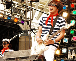 With their skewed approach to grunged-up rock music, Tokyo's HiGE were the weirdly wonderful headliner of Rock In Japan's Sound Of Forest Stage. Taking to the stage with painted faces and sounding like one part Nirvana and four parts madness (the mental condition, not the band), the five-piece launched into off-kilter tunes that could — and should — be anthems. Singer/guitarist Hisashi Suto climbed the lighting rigs, kissed the colored plastic gels on the stage lights, then tightrope-walked along the crowd barrier, while his band delivered dual-drum debauchery on stage.