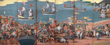 But perhaps the most historically fascinating are the screens depicting Western subjects: Western kings, European cities, the Battle of Lepanto, and the arrival of Europeans at the ports of Kyushu, all dating from that brief late-16th- to early-17th-century period before Japan isolated itself from the rest of the world until the 1850s.