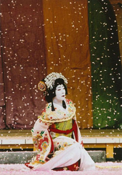 In Part 2, Kamejiro is the beautiful princess Yukihime in "Kinkakuji (The Golden Pavilion)" adapted from Act IV of the 1757 bunraku play "Gion Sairei Shinkoki (A Record of the Gion Festival)." Staged against spectacular scenery, the one-act play is a superb example of the stylized beauty of kabuki. "Kinkakuji" centers on the princely villain Matsunaga Daizen (Nakamura Shido) who, having defeated Shogun Ashikaga Yoshiteru, is holding the shogun's mother Yukihime and her husband Kano Naonobu (Nakamura Shichinosuke) hostage at the Golden Pavilion in Kyoto. Daizen has also killed Yukihime's father, Sesson, and she tries to take revenge. But Daizen has her tied to a cherry tree and orders Naonobu beheaded. Standing helpless in a storm of cherry petals, Yukihime gathers a pile of them on the ground using her foot and traces the outline of a mouse in them. Miraculously, two of the creatures appear and chew through the ropes that bind her body. Set free, she joyfully runs away to join her husband, whose life has actually been spared by a secret ally, the warrior Konoshita Tokichi (Nakamura Kantaro).