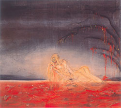 The move was initially a good one for Tamamura, and in 1918 he won the Inten's Chogyu Prize for his picture scrolls "Ugetsu Monogatari (Tales of Moonlight and Rain." Regrettably, the originals were destroyed in the 1923 Great Kanto Earthquake, and Tamamura painted the versions on display in the current exhibition between 1923 and '24. "Ugetsu Monogatari" was a series of supernatural tales penned by Akinari Ueda in the 18th century, and Tamamura's visual and calligraphic reworking of the text in nine scrolls tends toward a scratchy, rough finish. He focused on sensationalistic visual moments from the tales — in particular, a grotesque and nearly naked "Cannibal Priest" who gorges himself on flesh atop a ground red with blood.