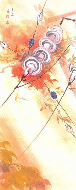 In hatching the Hokuto Society in 1930, Tamamura returned to nihonga with the aim of reconceiving the nature of the medium. Despite whatever revolutionary fervor he had envisioned in the above activities, Tamamura's return to form led him to depict highly conventional, airily Impressionistic scenes of urban contentment, with occasional forays into themes from Japanese literature and history. In his final decade's work, a proclivity for odd combinations of imagery also arose, as in the telephone wire "Insulators and Shower (Phoenix Tree)" (1943) or "Goldfish Bowl on the Tree" (1943).