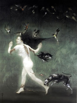 Matsui's paintings typically portray visceral scenes in the meticulous technique that many Japanese artists have foregone for more modern Western methods. (Along with Murakami, she is one of only two people to have gotten a Ph.D. in nihonga from the Tokyo University of Fine Arts and Music.) In the centerpiece of the new exhibition, "Scattered Deformities in the End" (2007), a woman running through a shady forest is chased by birds and a dog that tear at her hair and flayed skin. In another, pieces of disembodied flesh that represent successful and unsuccessful suicides act as untrustworthy guides through the dense Aokigahara forest near Mount Fuji that is famous as a place where people take their own lives.