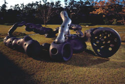What unites the objects at this exhibition is Karasawa's notion of creativity without the intrusive vision of the artist. Just as such visions or messages provide the DNA of art, decorative or utilitarian functions and manufacturing traditions provide the genetics of crafts. Without such DNA — such limitations — to guide them, both art and crafts become self-indulgent and can lose themselves in an amorphous, almost cancerous wilderness. A large bronze work by Masayuki Hashimoto, "Orchard: Sunlight Penetrating Fruit, Fruit in Sunlight Filtering Through Leaves " (1978-88), is a case in point. Ten years in the making, "Orchard" has pride of place at the exhibition because it is a perfect example of Karasawa's central concept: The perfect cross-border raider, it neither offers a craft-like function nor an art-like concept.