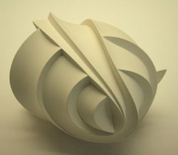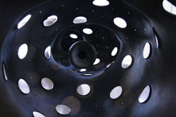 The exhibition then is an attempt to embody a philosophy of aesthetic creation that emphasizes materials and working methods over the ideas, visions, or concepts of form that have traditionally dominated Western notions of art. "Our work is less based on form (meaning the artistic will). Rather, it evolves from the very physiology of the clay, and the processes by which the object is constructed," said the founder of the Sodeisha group, potter Kazuo Yagi (1918-1979), whom Karasawa sees as a forefather of this philosophy. Some of the works in the exhibition bear out this hands-on or materials approach more obviously than others. Oni Hagi (Devil Hagi), a late-career approach to Hagi-ware pottery by 98-year-old Miwa Jusetsu that blends various clays with coarse materials such as sand and a mottled white glaze, gives off the warmth that down-to-earth, handmade objects have. Aki Rusu's "Latent Heat Effect" (2003), a sculpture of partially melted and twisted sheets of metal has a similar rawness — but without any of the warmth or beauty.