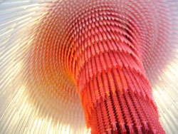 On the other end, Spanish artist Ana Laura Alaez has installed a hexagonal, glowing blue tunnel that beckons visitors from the outside and lightly pulses with music on the inside. In the middle are two more open rectangles, one housing the entrance to TAC, with a bright, zig-zagging floor done by Jim Lambie, who also showed last year at Tokyo Opera City Gallery's "Melting Point." The other has a hanging work by New York-based Do Ho Suh. Ho Suh has suspended interlocking glass figurines of men — in an outside, transparent curtain and inside blood red spike — so that they dangle like a massive chandelier. Inviting and contemplative, TAC director Yasuko Murayama says the piece addresses the cycle of life and rebirth in a simple language, suggesting both fragility and the depth of our interconnections.