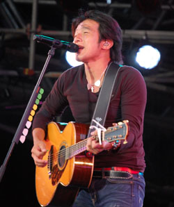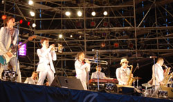 Later on, Yura Yura Teikoku 's midnight set brought the main stage closest to a Hendrix moment, the snake-hipped Shintaro Sakamoto firing off a succession of increasingly synapse-frying guitar solos in between catchy psychedelic pop ditties. Rovo promised to take things to an even higher level after that, but their seemingly never-ending set became a bit of a yawn.