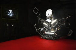 Kensuke Sembo and Yae Akaiwa of Exonemo show off some of the great work that is being done in Japan using video and PC technology. Alone in TWS back room, an ungainly metal frame of pipes, golf clubs and ringing bells and cymbals is topped by a clock that is racing erratically back and forth. After your attention passes from this clanging thing you will notice on the wall a screen that shows the room you are in, but with someone other than yourself in it and the clock standing still — wait long enough and you will see your past self in the room.