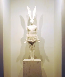 In Yokohama, Koh is presenting "Boy by the Sea" (2008), an 88 percent-scale wooden sculptural portrait of himself on a plinth (the superstitious Koh says the number 88 represents, for him, the concept of double infinity). The sculpture is covered in more than 80,000 crushed pearl beads and topped with similarly decorated wooden bunny ears. The sculpture and plinth in turn became elements in an eponymous parade the artist organized for the preview night of the Triennale on Sept. 12.
