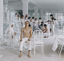 If there is any doubt that New York-based artist Terence Koh has perfected the art of winsome provocateurship, it was put to rest upon reaching the terrace of his Shibuya penthouse hotel room, where a plastic, spermatoza-shaped chalice, filled with milky white liquid, lay innocuously on the artist's deck table. Metal wiring threaded through the white, smiley-face cap of the chalice connected the object to a string of pearl beads. Koh barely gave it a second glance as he busied himself with preparations to leave for Yokohama, where he is included in the Yokohama Triennale 2008, "Time Crevasse."