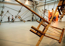 One British curator I met, a veteran of the art event but slumming it for the first time in the architecture show, summed up his reaction in a pithy epithet: "bad art." Indeed, one of the simplest, aesthetically effective, and most quietly significant installations of the show was by a leading figure of the contemporary art world, Ai Wei Wei, in collaboration with the Swiss architects Herzog and De Meuron, a reunion of the talent that gave China and the world the wondrous "bird's nest" of the Beijing Olympic Stadium. A fragile space-frame of bamboo poles and suspended chairs fills a large room in the Italian pavilion. A closer look reveals that the poles are extensions of the legs of the chairs, examples of the traditional furniture seen on street corners across China. Without recourse to any labored text, this installation speaks profoundly of tradition and modernity, West and East, and is both poignant and beautiful.