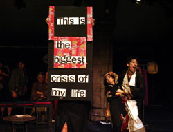 I am always annoyed to have to read subtitles when great foreign theater companies come to Japan, because you spend all the time looking at the electronic screen and miss a lot of what is happening on stage. So I try not to use those kinds of subtitles, but instead incorporate punchy story-line aids in English on placards we build into the play, and sometimes we'll have a brief plot narration in English halfway through.